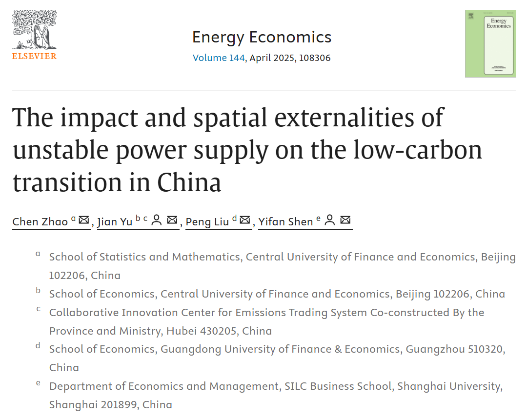 我中心研究员俞剑教授在国际能源权威期刊Energy Economics 发表论文“The impact and spatial externalities of unstable power supply on the low-carbon transition in China”。